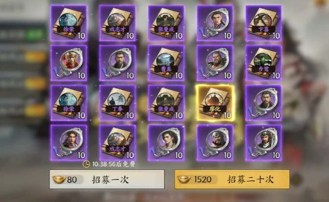 新手池抽完转群英荟萃常驻池,全程开放含常规武将和兵书,每20抽必出橙道具。新手池结束后投100抽,累积保底次数,碰马超、赵云等武将。注意,这池没三皇,得等限时活动或特定卡池。