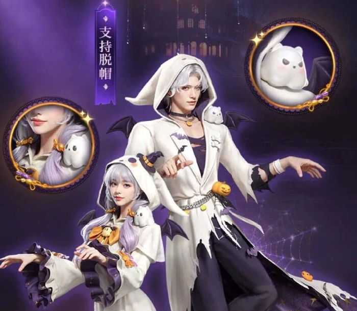 床单小鬼时装走趣味路线,还原经典捣蛋鬼形象:披白床单,顶发光南瓜灯,戴蝴蝶结小帽子,支持切换戴帽/不戴帽状态,方便展示发型面容,适合互动玩法和节日任务。