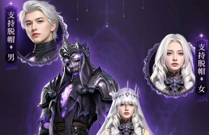 净罪颂祷时装主打宗教幻想风:女性穿纯白长裙,配冰晶头饰、薄纱、蕾丝袖口,幽火点缀;男性披银色护甲,胸前燃紫火,戴荆棘冠冕,尽显审判者肃穆。