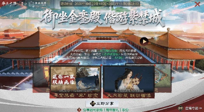 联动2025年10月22日上线,玩家从游戏内率土庆典入口进专属故宫观唐联动页面。活动融合古代艺术与三国策略玩法,玩家体验征战乐趣,感受唐代美学与宫廷文化氛围。分享活动界面得周年献礼积分,兑换限定奖励。