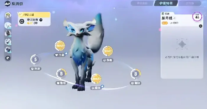 月光狐,又称胧月狐,开局可选初始精灵,蓝白外观,小巧狐狸造型,辨识度高。切换形态进狭窄区域,提升探索效率。属稀缺光系精灵,后期难获同类属性,早期拥有很重要。