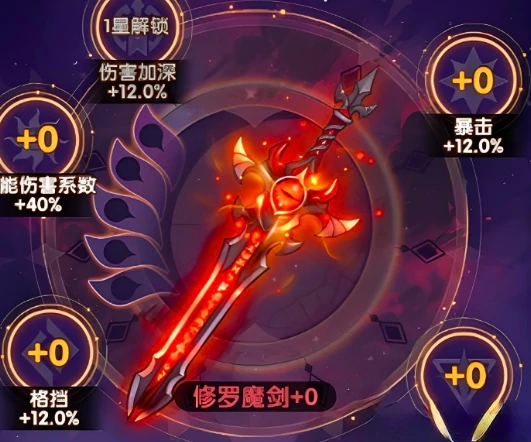 第一件修罗魔剑,五个槽位,强化伤害、魔法格挡、暴击、抗暴击和技能效果。装备后提高20%技能伤害,技能释放附加额外增伤。适合输出型或暴击流派队伍,显著提升全队战斗属性。