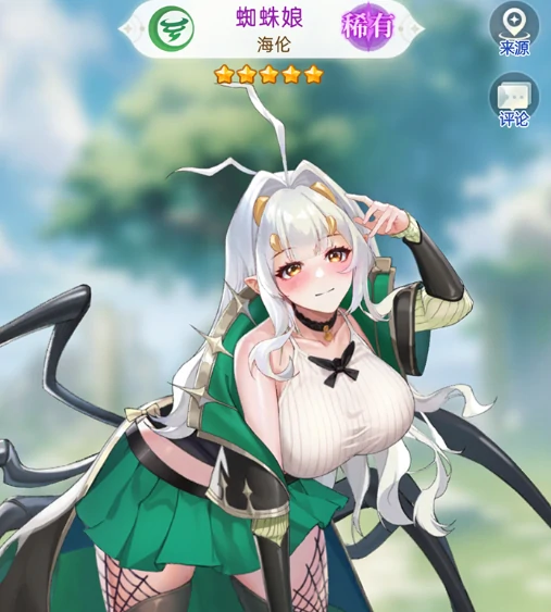 蜘蛛娘海伦:风系守卫,五星稀有度。经营蛛丝防具店,技能“蜘蛛军团”“蜘蛛体质”提供防御免伤,擅长控制生存,可靠前排。