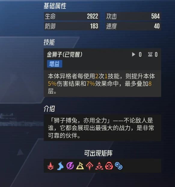 矩阵选择上,优先配置提升全队暴击或技能伤害加成类型。此类矩阵能强化金狮子输出节奏,加快被动叠加效率,助其提早进入强势期,同时弥补队伍输出短板,增强整队高压对局中的生存与续航能力。