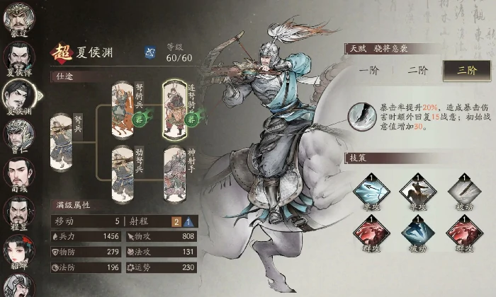 第二梯队武将延后升阶。夏侯渊二阶加15%暴击,是弓兵体系核心输出,三阶回战意效果没用,不用优先升。夏侯惇二阶残血回32%兵力,没治疗将时生存价值高,三阶提升小。张郃三阶才强势,激活全武将克制增伤15%,搭配副将臧霸叠加到20%,高难关卡表现好。