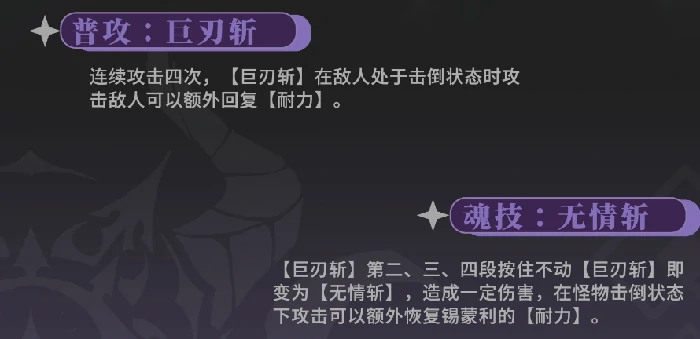普通攻击:连斩四次,命中倒地目标回耐力;长按释放强化斩,增伤并回魔力,兼顾输出续航。