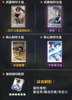 刻印搭配:强化闪避与体术输出协同。武器刻印首选厉雷驰骤,次选空降瀞灵庭,提升闪避后伤害转化。核心套装用寂夜瞬影,保证暴击率、暴击伤害、攻击力良性循环。基础刻印选白打与鬼道组合,后期补铜骨·上巩固输出。界限技能兼顾生存增伤,保障连招完整。