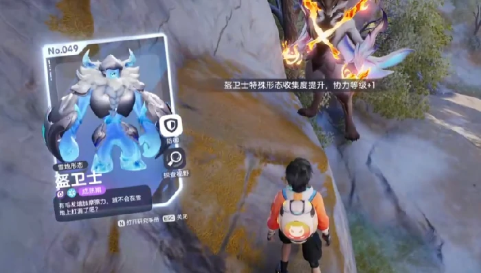 雪地盔勇士,冰属性精灵,战斗带控制,技能围绕冰属性,适配多种实战场景。解锁雪地地图,主动触发机关,在开阔区域找两个紧挨的大型雪球,这是捕捉关键。
