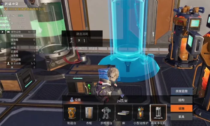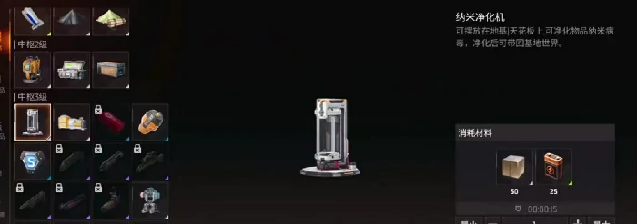 战局物资带回前提:解锁工作台!初期速用零件解锁工作台,打开制造菜单,制作纳米净化机。部署纳米净化机,战局拾取道具必须经其处理才能带离对局。