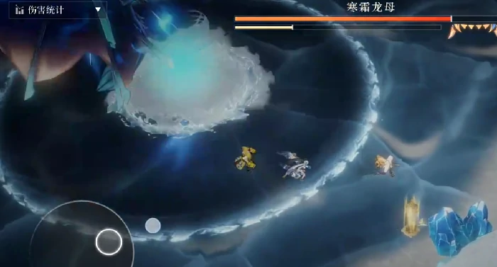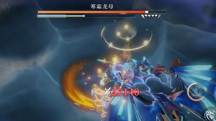 紧接着,BOSS以逆时针90°角喷射寒霜,技能带冻结且伤害极高,必须随龙头转动方向同步移动躲避。之后龙母起飞盘旋一周落地,释放渐扩冰环,持续保持在冰圈外,避免重创。