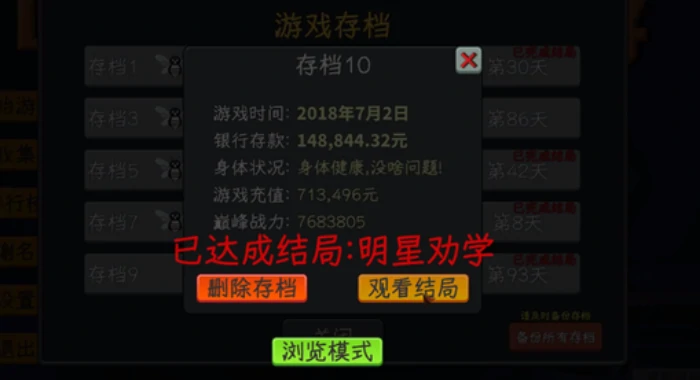 解锁明星劝学结局:走高投入路线。变现所有房产、车辆等资产,向亲友借款,资金全充游戏。资源耗尽,参加城主战失败,自动进明星劝学剧情,周目结束。之后开新游戏,试其他结局。