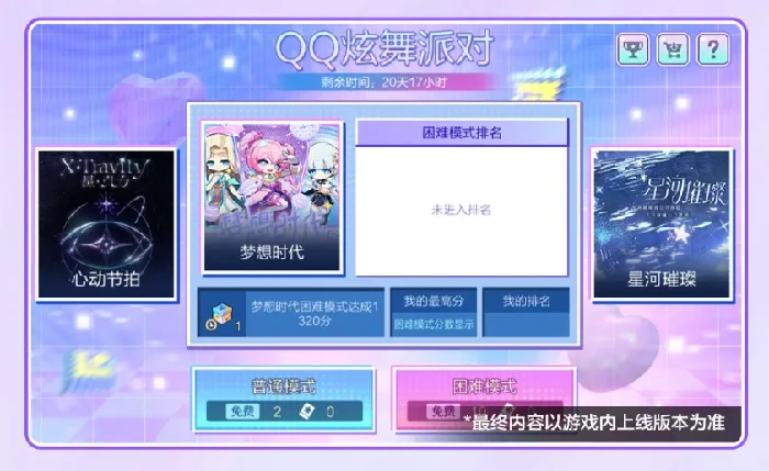 参与QQ炫舞派对:10月22日-11月12日限时开放。经典曲目任选,普通/困难两种模式挑战。每日普通模式2次,困难模式10次。通关领当日奖励,高分完成成就、冲击排行榜,赢额外荣誉奖励。