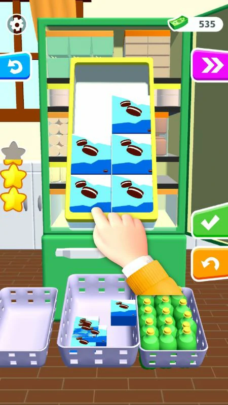 开心翻不停以冰箱为场景,创新无限收纳玩法。关卡冰箱布局各异,物品体积形状不同。玩家需观察冰箱空间,结合物品尺寸,规划放置,完成通关。