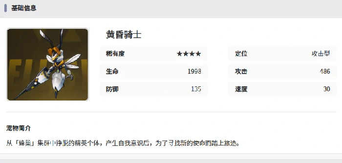 伊瑟智壳黄昏骑士,四星输出型,蜜蜂外观,主打攻击定位,需搭配角色激活觉醒效果。核心机制为削弱敌方防御,提升团队输出,单核心技能效果突出。