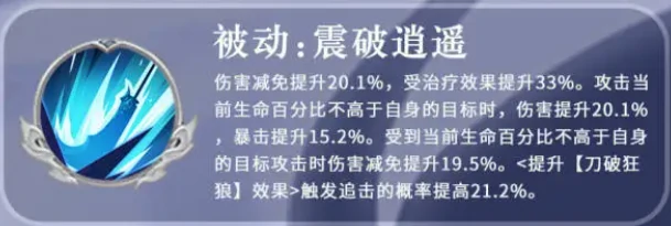 主动“劈穷斩”:单体攻击(伤害同必杀技),附加2回合暴击提升状态。被动“震破逍遥”:提供20%伤害减免,受治疗效果增33%;攻击生命值低于自身目标时增伤20%,暴击额外增伤15%并获得16%伤害减免,强化残局作战能力。