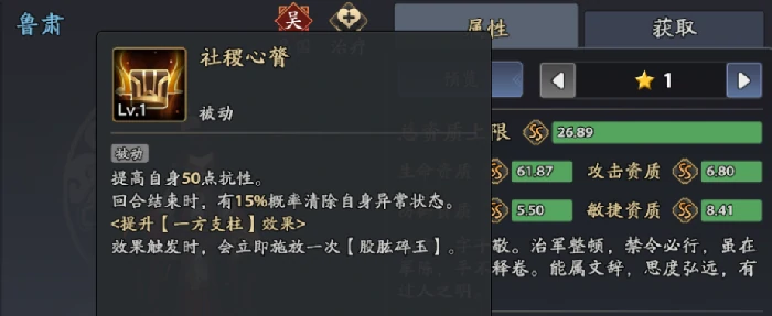 鲁肃核心优势聚焦生存辅助:基础被动提升异常抗性,受负面状态触发回合末净化,增强场上稳定性;生命值降至40%激活关键被动,立即清除全部负面状态(无视抵抗),回复大量生命并附加两回合免疫控制、三回合防御提升,触发次数每5回合重置(5/10/15回合),长线作战生存反打能力突出。
