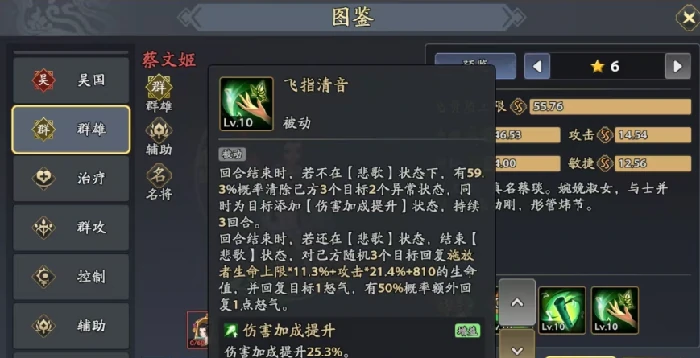 核心被动“飞指清音”随状态切换效果:普通状态下,回合结束概率清除3名友军2个异常状态,附加最高25%伤害加成(持续3回合);悲歌状态下释放技能后,为3名武将回血并恢复1点怒气,有机会额外再回1点(最高2点),显著强化队伍续航与爆发节奏。