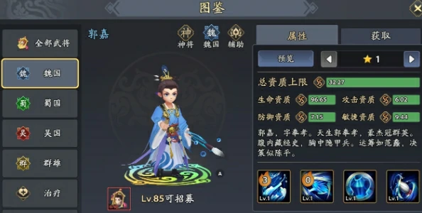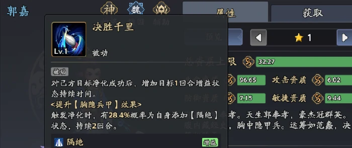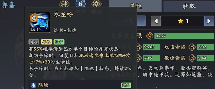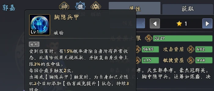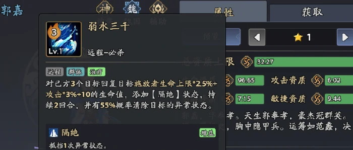 战局乱了别慌,郭嘉技能来救场!单体技能奶指定目标,概率清负面,清掉就追加治疗。奶量虽不如专业奶妈,但保核心输出一绝,隔绝护盾+回血,生存直接拉满!