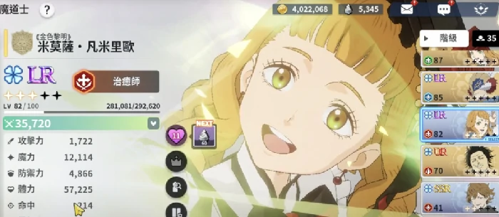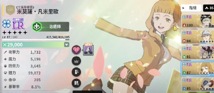 黑色四叶草治疗核心角色米莫萨,SSR品质,主打团队治疗与状态恢复。