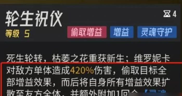 终极技能:冷却四回合。对单个目标造成420%攻击力伤害,抽取其所有增益状态转化为全体友军增益,附加灵魂守护效果为队友回复生命。