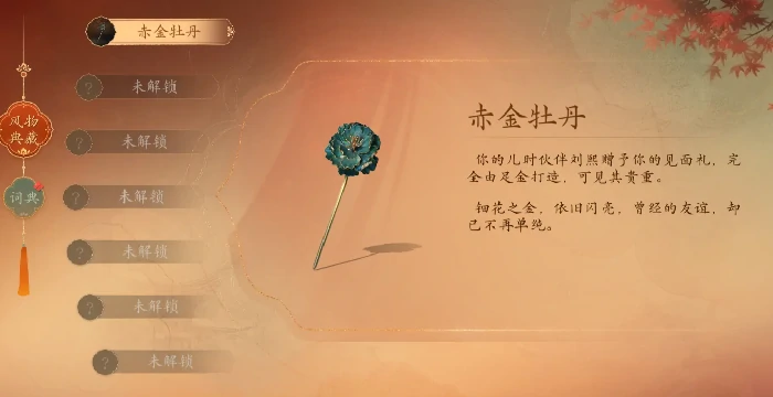 刘熙,第一章与玩家共同出现,入宫前赠玩家赤金牡丹簪。