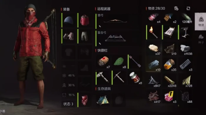 兽皮制作防寒衣物,提供基础保暖;30级后分配进化点数到抗寒能力,减缓体温下降;罐装羊汤作为主要热量补给,恢复针剂快速回血。