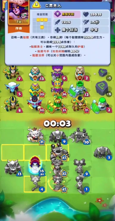 阵容构筑:若作核心输出,围绕黑暗军团单位搭配,如傀儡、巨兽等前排。注意续航,加入图腾或治疗单位维持血量。召唤骷髅共享亡灵夫人生命属性,治疗效益覆盖全场。