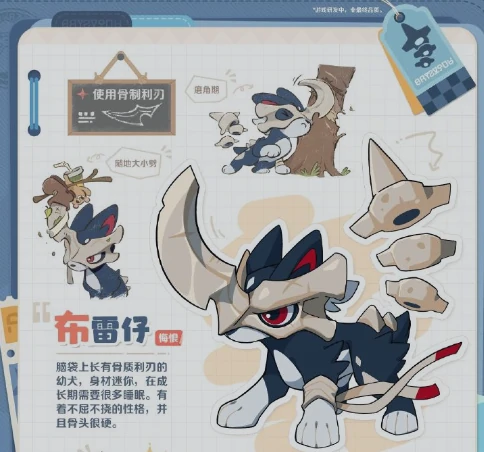 布雷多格:身高99厘米,头顶刀刃状独角,骨骼坚韧,个性倔强,专注磨角,自我意识强。
