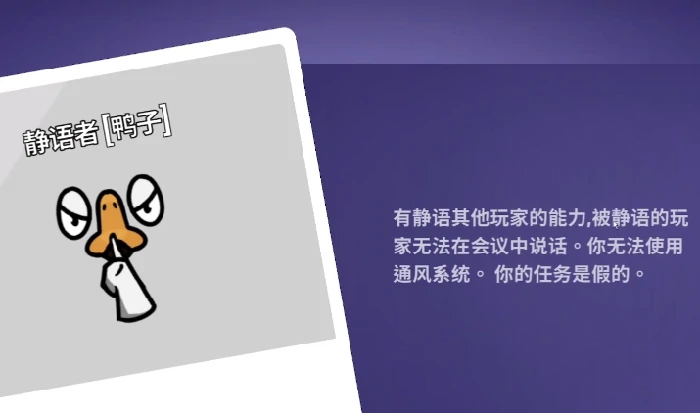 鸭子阵营:搞破坏、杀玩家、骗对手。专业杀手:杀人隐身,加拿大鹅不报警,近距才发现。间谍:会议偷看身份。静音鸭:禁言玩家,断信息。