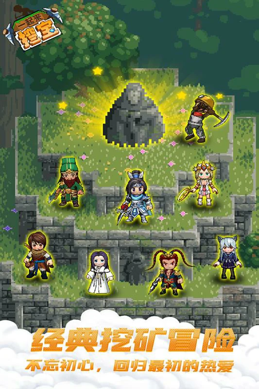 放置战斗,像素画面。推进关卡,遭遇强敌。手动挖掘,收集资源。提升伙伴,挑战高难。