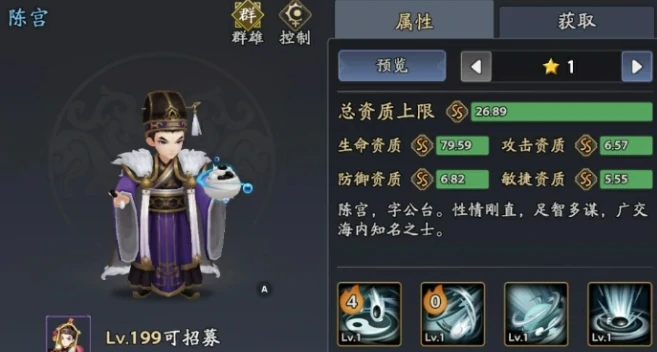 推荐组合:陈宫、甄姬、张春华、廖化、貂蝉。控制链稳健,陈宫需199级招募,总资质26.89,控制型武将属性出色。大招攻击敌方全体,造成48%攻击力伤害,20%概率附加持续三回合迟滞效果,提升20%命中,克制敌方闪避,确保控制生效。被动技能实用。