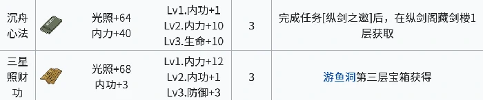 3级内功:沉舟心法,加40内力、64光照,完成纵剑之邀任务,去纵剑阁拿;三星照财功,加3内功、68光照,游鱼洞三层找。