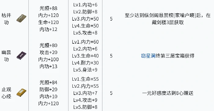 5级内功:幽昙功,加20攻击;止观心经,加20防御;野夫真经,加100耐力、2内力恢复速度。