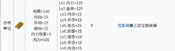9级内功(最高品质):白帝神功,觅影洞三层宝箱拿。加130光照、25内功、25外功、25硬功、3内力恢复、500内力,提升全面。