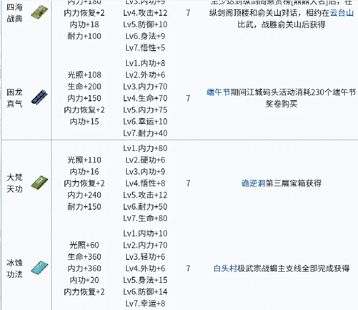 7级内功(高品阶):四海战典、困龙真气、大梵天功、冰蚀功法。属性强,获取难。比如四海战典,需纵剑阁悬赏榜达鼎鼎大名,剧情击败俞关山后拿。