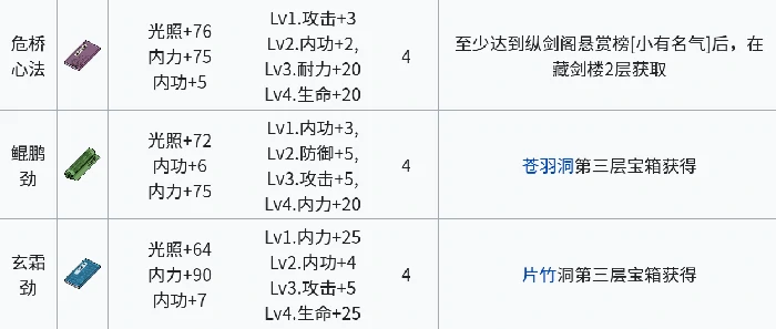 4级内功:危桥心法,加68光照、75内力、5内功;鲲鹏劲,加72光照、75内力、6内功;玄霜劲,加64光照、90内力、7内功。