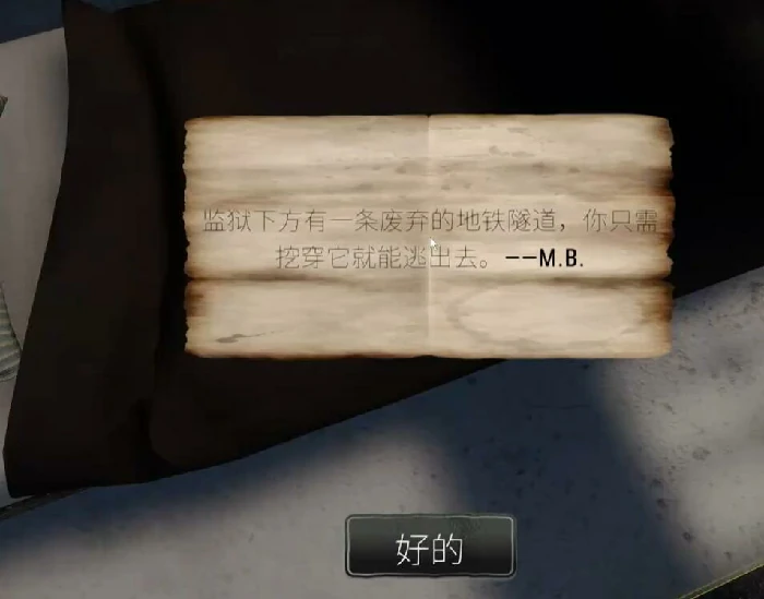 玩家因经济犯罪入狱,首日获同伴纸条:牢房下方有隐藏通道,挖开地面砖块可逃,收到消息立即准备。