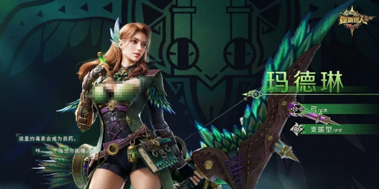 玛德琳,弓箭主武器,远程精准打击怪物弱点,造成显著伤害。提供团队增益,辅助任务完成。兼用毒药与孢子类道具,强化辅助作战。