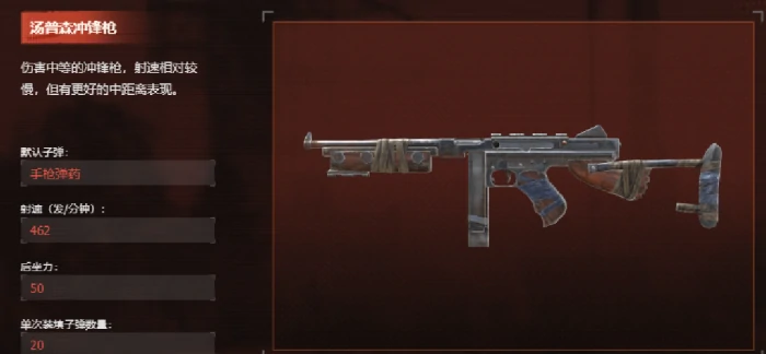 汤姆逊冲锋枪属中伤害型,中近距离交火表现佳。高射速可快速压制敌人火力,适合遭遇战和快节奏冲突。单次装弹20发,数量适中,控制好距离能发挥良好压制效果。