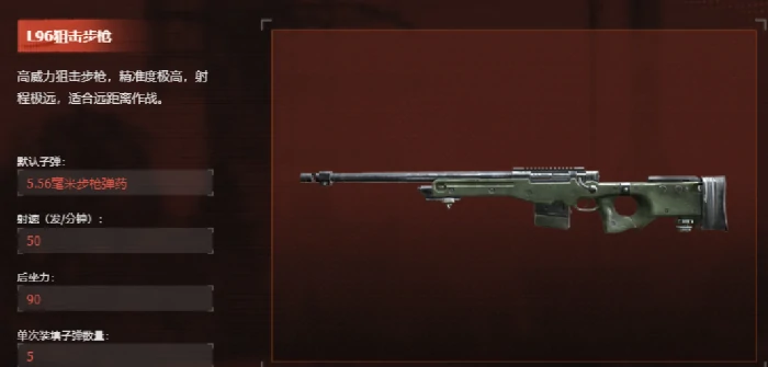 L96是军用级别狙击步枪,专为远距离输出设计,精度极高,适合远程伏击、拦截。弹匣容量小,仅5发子弹,对玩家射击精度和时机把握要求高。敌人未靠近时,可用其提前有效打击。