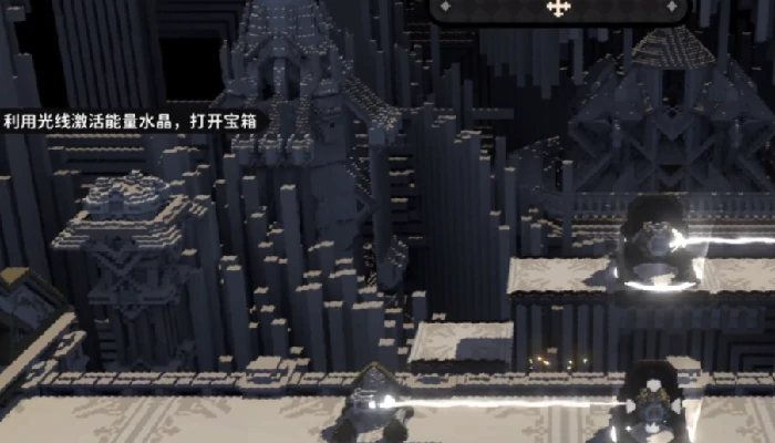 第二关:前行至大平台,交互镜面使其上翻传光;降平台至地面后左移,再次翻转镜面,调右下方镜面角度,将光线反射至右侧区域。