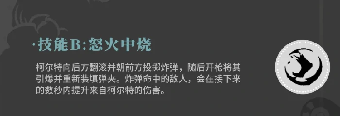 一技能“莫桑比克射击法”也看弹药匣。先攒够火力值,发动就消耗,对着前方敌人高速连射。二技能“怒火中烧”带后翻,接着扔炸弹。炸弹要手动射击引爆,炸中提升柯尔特伤害一段时间,还能补点弹匣。这技能适合起手,为后面输出打基础。