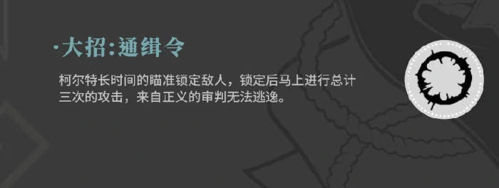 大招“通缉令”冷却长。用的时候长时间瞄准锁定单个目标,然后三次高威力射击。就算目标有闪避技能,也躲不掉全部伤害。
