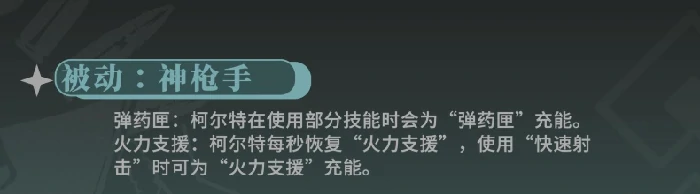 总之,柯尔特输出稳,技能机制围绕弹药管理和弱点打击。队伍要持续输出型成员,选他就对了!