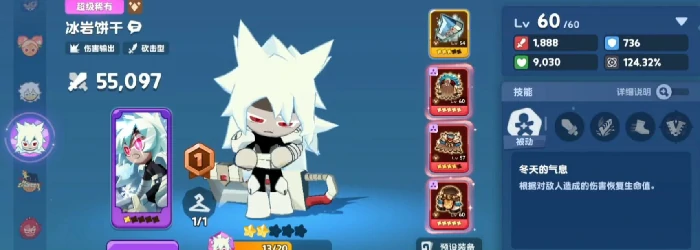 冰岩饼干为超级稀有级土属性输出角色。60级时,1888攻击力与124.32%属性加成出色,防御736、生命值9030,身板脆,必须搭配治疗角色。其以血换伤机制在高难关卡易翻车。核心爆发技能极限酷寒,释放可冰冻大范围敌人,需依赖普攻积累能量。该技能操作简单、不易放空,敌人冰冻期间普攻转为多段冰刃斩。第三段普攻自带小范围AOE,清杂时边移动边输出以控制更多敌人,清理小怪手感流畅。升级优先提升冰冻持续时间与普攻段数,先用小技能聚怪再开大,提高输出效率。