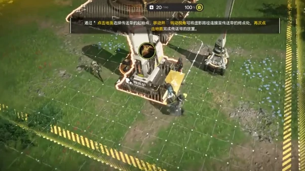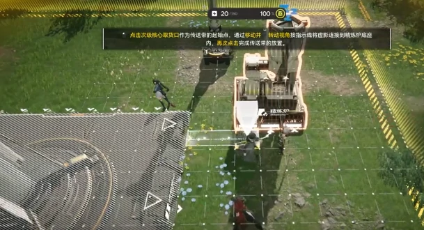搭建可用产线,先找起始位置。从取货口开始,画面出现传送带虚影,顺着虚影拉向精炼炉方向。注意传送带必须同时连接协议中心,否则材料无法循环,产线无法运作。拉动时转动视角观察路线,耐心调整角度确保准确。