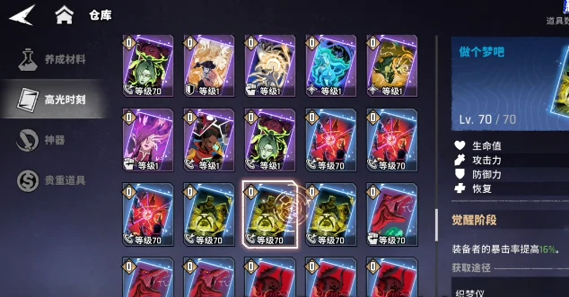 防御角色选暗中的光,提升承伤能力。辅助用织梦人,回能效果好,队友技能释放更频繁。通关主线、活动副本,积累资源,把蓝色装备换成紫色、金色,逐步提升实力。神器选择结合职业特性,后期按阵容微调。战士为例,依赖技能输出戴永恒的标枪,靠大招输出用瓦图姆之杖,其余位置补午夜手枪等功能型神器。