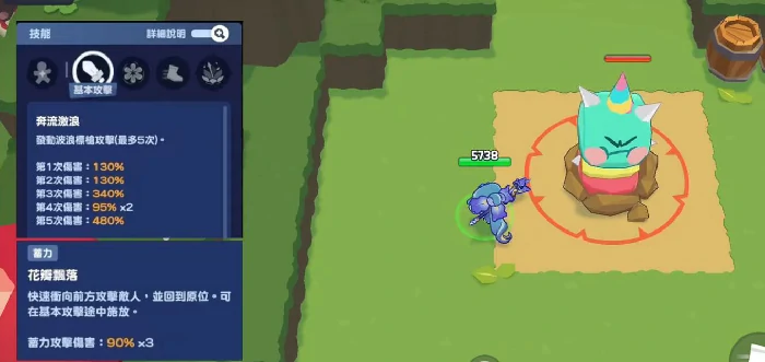 主动技能奔流激浪五段伤:130%×2→340%→95%×2→480%,蓄力命中叠浪花印记,满5层触发全额伤害。波涛奔腾冷却15秒,生成10%最大生命值护盾,进入浪花舞潮状态,扩攻距提30%速。被动波浪延长增益4秒,暴击强度升50%,体验秒杀。