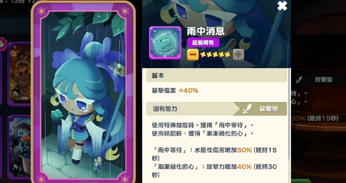 发挥输出潜力,蓄力攻击命中叠层,满5层攻翻倍,持续15秒。连招:蓄力→黑暗剑击→必杀技。BOSS战开局3秒蓄力叠层。法宝选雨中消息,蓄力命中加25%暴击伤害。阵容配白玉草饼干治疗、牛奶饼干护盾。全输出配置效率高,无辅助难叠层,需合理配队。培养优先升技能,再法宝,最后等级,强化奔流激浪和波涛奔腾。把握蓄力时机,保层数不断。操作有难度,熟练后成输出核心。