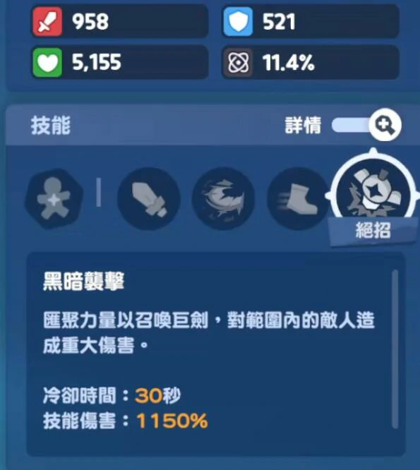 被动“极度孤独”靠蓄力攻击命中叠加层数,满5层8秒内攻击力翻倍,需持续蓄力维持层数,操作有要求。普攻基础倍率,蓄力攻击1.2倍伤害并叠加1层被动,蓄力虽耗时间但爆发收益显著,是打高额伤害关键。小招“黑暗剑击”基础倍率7.5,满层被动提升至14倍以上;必杀技“黑暗袭击”超20倍伤害,冷却30秒,满星穿透50%防御。蓄力条将满瞬间松开比自动释放快,可抢在BOSS出招前打出首击,叠加层数并规避伤害。“黑暗剑击”闪电伤害触发“后悔卡”额外暴伤增益,推荐连招:小招接普攻再蓄力,覆盖增益时间。
